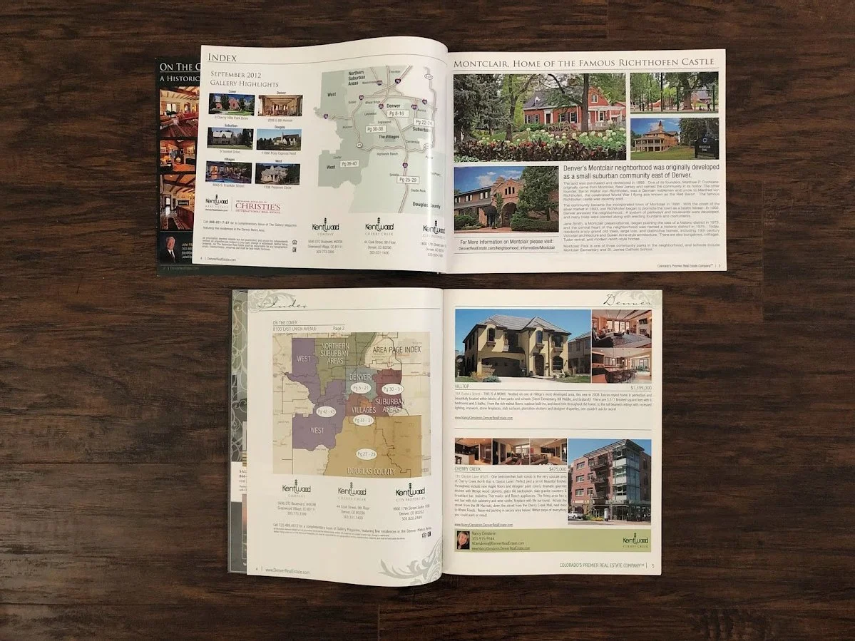 Please note that the entire magazine process including organizing orders for ads, page layout, typography and design, cover art, external ads and managing our print vendor and mailing lists were all by me. (Photography was provided by the agents, but photo editing & enhancing was done by me.)